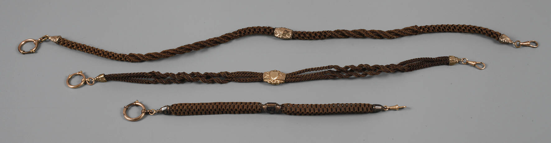 um 1880, aus braunem Echthaar geflochten, Montierung aus Doublé, guter Zustand, L 25 cm, 42 cm und 54 cm.