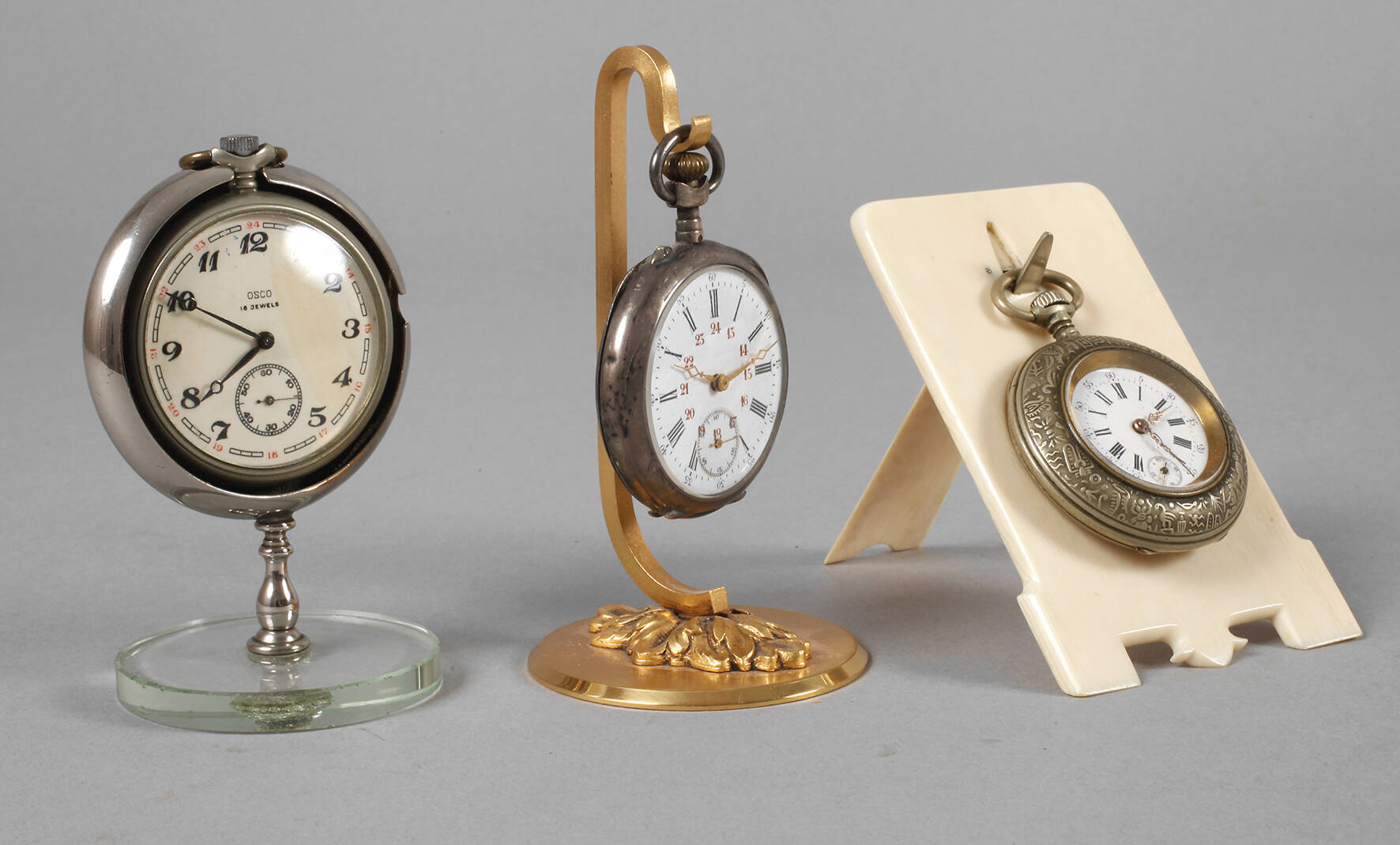 1880-1950, aus Elfenbein, Glas und Metall, beigegeben je eine Taschenuhr, diese nicht funktionstüchtig, H 7 cm, 10 cm und 11 cm. BITTE BEACHTEN: VERSAND ERFOLGT NUR INNERHALB DER EU - SHIPPING TO EU MEMBER COUNTRIES ONLY.