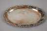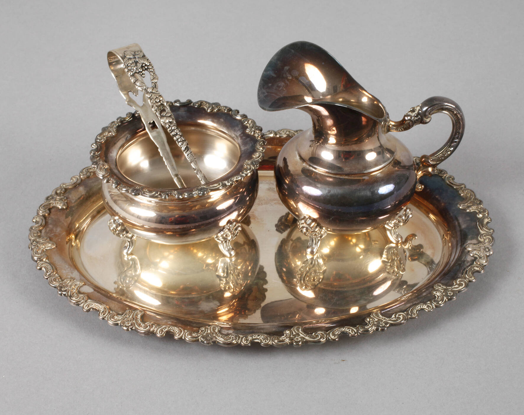 Mitte 20. Jh., gestempelt 925 Sterling Silver, Halbmond, Krone und eine weitere ungedeutete Punze, die Ränder verziert mit Rocaillenmotiven, dazu eine Zuckerzange mit Traubendekor, gestempelt 800, L Tablett 22 cm, G total ca. 329 g.