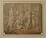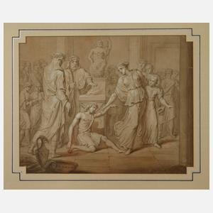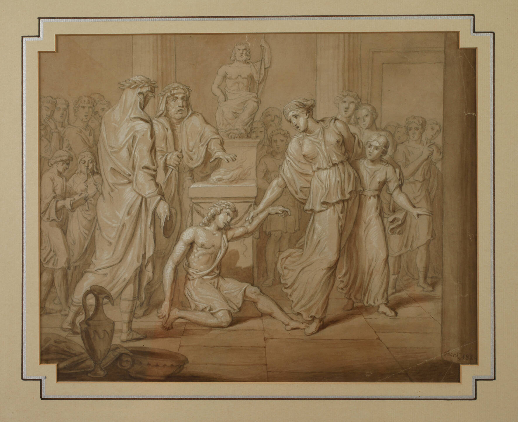 dargestellt ist die Szene als Nephele ihren Sohn Phrixos samt seiner Schwester Helle ruft, weil ihr Gemahl Athamas in einer Prüfung Phrixos opfern will, Sepiazeichnung mit partieller Weißhöhung, rechts unten signiert und datiert „Stark 1829“, partiell Knitterspuren und kleine Einrisse, unter Passepartout und hinter Glas gerahmt, Passepartoutausschnitt ca. 24 x 30,5 cm.