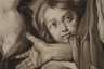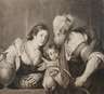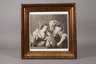 älterer bärtiger Mann mit krausem Haar im Gespräch mit einer jüngeren Frau, währenddessen ein Kind dem Greis eine Schale reicht, lavierte Tuschezeichnung, Anfang 19. Jh., partiell berieben, unter Passepartout und hinter Glas in ca. 8 cm breiten Ochsenaugenrahmen gerahmt (mit geringen Verlusten), Passepartoutausschnitt ca. 35,5 x 39 cm, Falzmaße ca. 42 x 42 cm.
