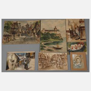 sieben Blatt verschiedener Genres, Aquarell und Deckfarben, Ende 19. Jh., teils signiert, unterschiedliche Erhaltungen, Maße max. 25 x 35 cm. Künstlerinfo: dt. Bühnenbildner und Genremaler (1858 Hamburg? bis 1939 Moritzburg?), tätig als Hoftheatermaler in Dresden, lebte in Moritzburg-Eisenberg bei Dresden, Quelle: Busse und Internet.