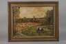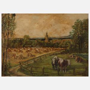 sommerlicher Blick über Weide mit Rindern, abgeerntetes Kornfeld mit Strohpuppen, hin zum Dorf mit imposantem Kirchturm, pastose Landschaftsmalerei, Öl auf Karton, um 1940, rechts unten signiert und ortsbezeichnet "Johannes Carlé Plauen", restaurierungsbedürftig, gerahmt, Falzmaße ca. 58 x 77 cm. Künstlerinfo: eigentlich Emil Leonhard Johannes Carlé, auch Johann Carle, dt. Dekorations- und Kunstmaler (erwähnt 1891 bis 1950 in Plauen), studierte ab 1891 an der Akademie Dresden, spätestens ab 1905 tätig als Malermeister und Dekorationsmaler in Plauen, Quelle: Internet, Matrikel der Dresdner Akademie, Vogtlandanzeiger und Plauener Adressbücher.