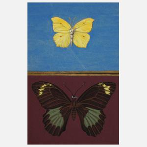 detailgetreue Darstellung von zwei Schmetterlingen mit ausgebreiteten Flügeln, Deckfarben auf Papier, je rückseitig mit lateinischen Namen versehen, signiert und ortsbezeichnet „Walther Gasch Dens über Bebra“, ein Blatt weiterhin monogrammiert und datiert „1958“, Blattmaße max. 10,5 x 15 cm. Künstlerinfo: auch Walter Gasch, dt. Maler, Zeichner, Graphiker, Restaurator, Autor und NS-Funktionär (1886 Leipzig bis ca. 1962 Nentershausen-Dens bei Bebra), studierte ab 1905 an der Akademie Dresden bei Emanuel Hegenbarth und Oskar Zwintscher, hier Meisterschüler bei Gotthardt Kuehl und später bei Richard Müller, unternahm Studienreisen nach Holland, Frankreich und Italien, ab 1929 Assistent für Licht- und Tiefdruck an der Hochschule für Graphik und Buchkunst Leipzig tätig, als sächsischer Gaufachgruppenleiter der Bildenden Künste der NSDAP ab 1933 maßgeblicher Initiator der restriktiven NS-Kulturpolitik in Dresden, Mitglied der Dresdner Kunstgenossenschaft, Vorstandsmitglied im Reichsverband Bildender Künstler Deutschlands und Mitglied des "Deutschen Künstlerverbandes Dresden", beschickte 1939 die große Deutsche Kunstausstellung im Haus der Deutschen Kunst München, tätig in Dresden, Quelle: Vollmer, Dressler, Schülerlisten der Dresdner Akademie und Tsuḳerman "Geschichte und bildende Kunst – Jahrbuch 2006 für Deutsche Geschichte".