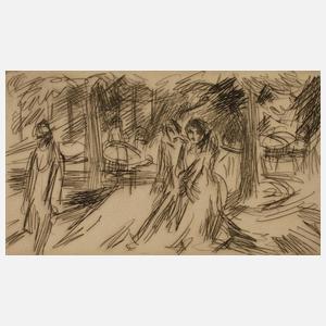 zahlreiche Spaziergänger in einem Park, Kaltnadelradierung, unter der Darstellung in Blei signiert und datiert „Max Schwimmer (19)23“, in der unteren linken Blattecke bezeichnet „Probedruck“, Provenienz: Prof. Dr. Fritz Hönsch/Leipzig, gleichmäßig gebräunt, Darstellungsmaße ca. 7,5 x 12,5 cm, Blattmaße ca. 15,6 x 23,2 cm. Künstlerinfo: dt. Maler, Graphiker und Illustrator (1895 Leipzig bis 1960 Leipzig), künstlerisch weitestgehend Autodidakt, zunächst Studium am Lehrerseminar Leipzig-Connewitz und zeitweise im Schuldienst im erzgebirgischen Oberseyda und Marienberg sowie in Lützschena bei Leipzig tätig, Soldat im 1. Weltkrieg, 1920–23 Studium der Kunstgeschichte und Philosophie an der Universität Leipzig, erste künstlerische Arbeiten entstehen, 1923–24 Lehrer in Eythra bei Leipzig, Mitarbeit an den Satirezeitschriften "Die Aktion" und "Der Drache", 1924–25 Studienreise durch Italien (unter anderem Sommerkurs bei Hans Purrmann auf Ischia) und Frankreich, anschließend kurzzeitig in Berlin, ab 1926 Lehrtätigkeit an der Kunstgewerbeschule Leipzig, parallel Pressezeichner und Kritiker der "Leipziger Volkszeitung", Mitglied im Bund Deutscher Gebrauchsgraphiker, 1933 aus dem Schuldienst entlassen, als "entartet" diffamiert" und zeitweise mit Arbeits- und Ausstellungsverbot belegt, anschließend Hinwendung zur Buchillustration, 1939 kurzzeitige Einberufung zum Sanitätsdienst, ab September 1944 zum Kriegsdienst als Wache des Kriegsgefangenenlagers "Stalag IVB" in Mühlberg einberufen, 1945 Direktor der Kunstgewerbeschule Leipzig, 1946–50 Professor für Graphik der Staatlichen Akademie für Graphische Künste und Buchgewerbe Leipzig, 1951–60 Professor an der Hochschule der Bildenden Künste (HBK) Dresden, Mitglied des Verbandes Bildender Künstler (VBK) der DDR, ab 1952 Mitglied der Akademie der Künste Berlin, Quelle: Thieme-Becker, Vollmer, Dressler, Eisold "Künstler in der DDR" und Internet.