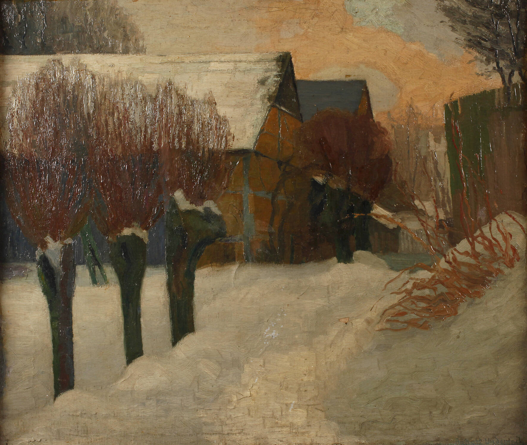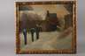 tief verschneiter Blick auf ein Bauerngehöft, im Licht der untergehenden Sonne, pastose Malerei in gedeckter Farbigkeit, Öl auf Leinwand, um 1920, rechts unten signiert „Rudolf Undeutsch“, hinterlegte Fehlstelle, teilweise Schollenbildung der Malschicht mit Verlusten, restaurierungsbedürftig, gerahmt, Falzmaße ca. 60 x 69,5 cm. Künstlerinfo: dt. Landschafts- und Bildnismaler, Schriftsteller und Graphiker (1884 Reichenbach/Vogtland bis 1939 Reichenbach), Kindheit und Schulbesuch in Reichenbach, Schüler der Gewerbe-Akademie Chemnitz, Studium an der Kunstschule Weimar bei Hans Olde, Ludwig von Hofmann, Max Thedy und Theodor Hagen, Mitglied im Reichsverband Bildender Künstler Deutschlands, tätig in Dresden, Quelle: Vollmer, Dressler und Internet.