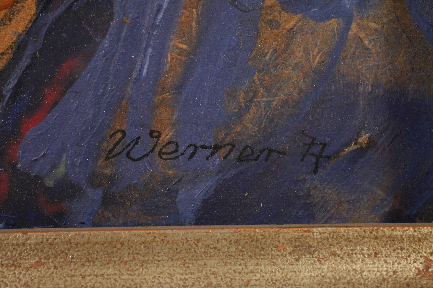 auf einem Stuhl sitzende und die Beine auf einem Hocker hoch gelegte junge Frau, Öl auf Hartfaserplatte, rechts unten signiert und datiert „Werner (19)77“, rückseitig betitelt „Entspannung“, gerahmt, Sichtmaße ca. 28,5 x 37,5 cm. Künstlerinfo: dt. Maler, Graphiker und Porzellankünstler (1928 Coswig bis 2019 Coswig), 1943–53 Lehre als Porzellanmaler, ab 1957 Dekorgestalter an der staatlichen Porzellanmanufaktur Meissen 1959–62 Gaststudium an der Hochschule für Bildende Künste (HfBK) Dresden, ab 1960 Mitglied des Kollektivs für künstlerische Entwicklung mit Peter Strang und Ludwig Zepner, 1967–71 externes Studium an der HfBK Dresden bei Rudolf Bergander und Jutta Damme, Werner entwickelte mehr als 100 Dekore, darunter unter anderem Blaue Orchidee auf Ast, 1001 Nacht und Jägerlatein, auch Gestaltung von Wandbildern aus Meissener Porzellan, 1973 Kunstpreis der DDR, ab 1978 Professor an der Hochschule für Kunst und Design Burg Giebichenstein in Halle, 2009 Ernennung zum Ehrenbürger von Coswig. Quelle: Eisold „Künstler in der DDR“ und Wikipedia.
