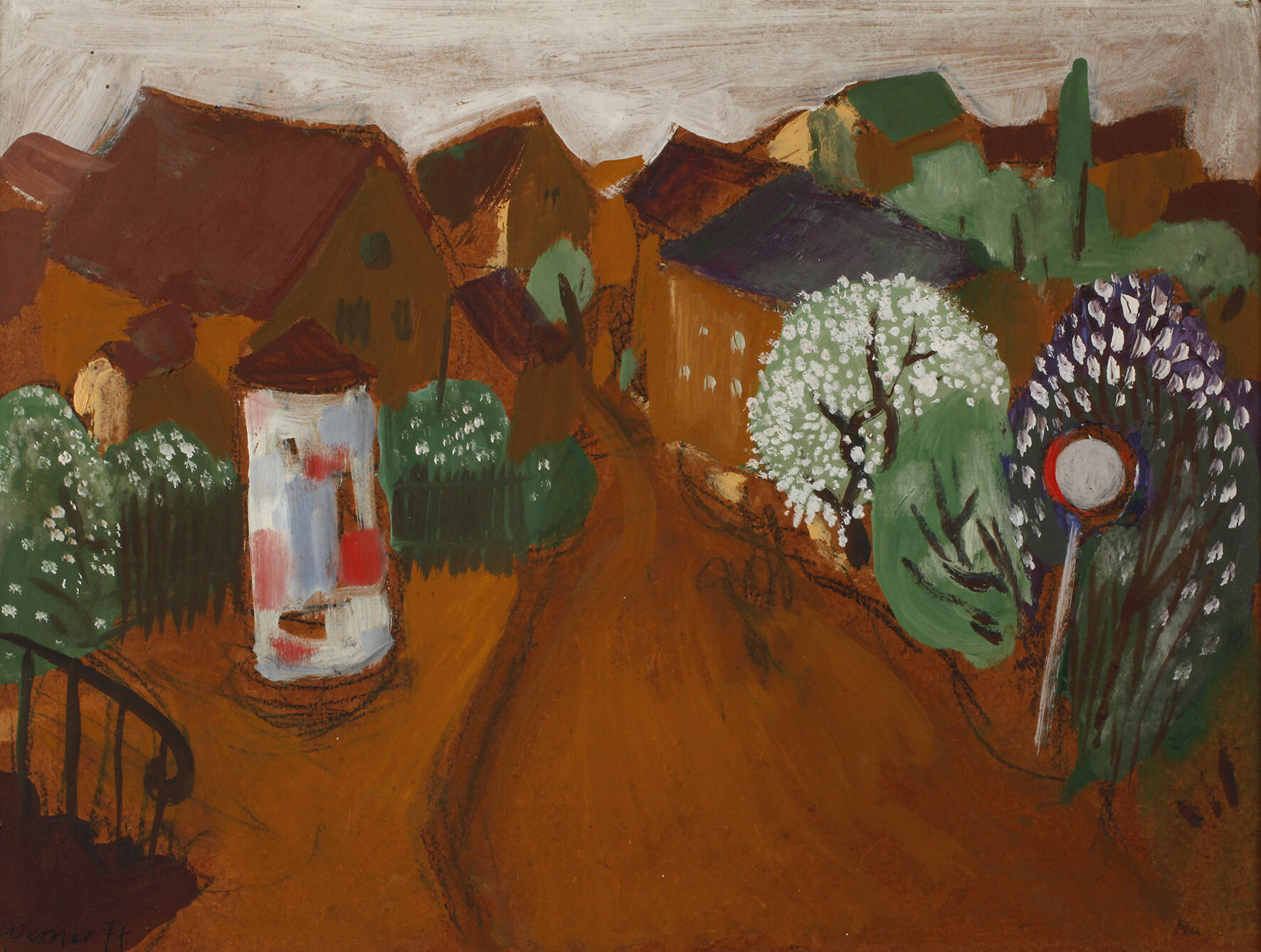 Blick entlang einer von Häusern gesäumten Straße, mit Litfaßsäule im Vordergrund, partiell pastose Malerei, Öl auf Hartfaserplatte, links unten signiert und datiert „Werner (19)77“, rückseitig betitelt „Kleinstadt II“, gerahmt, Sichtmaße ca. 23,5 x 31,5 cm. Künstlerinfo: dt. Maler, Graphiker und Porzellankünstler (1928 Coswig bis 2019 Coswig), 1943–53 Lehre als Porzellanmaler, ab 1957 Dekorgestalter an der staatlichen Porzellanmanufaktur Meissen 1959–62 Gaststudium an der Hochschule für Bildende Künste (HfBK) Dresden, ab 1960 Mitglied des Kollektivs für künstlerische Entwicklung mit Peter Strang und Ludwig Zepner, 1967–71 externes Studium an der HfBK Dresden bei Rudolf Bergander und Jutta Damme, Werner entwickelte mehr als 100 Dekore, darunter unter anderem Blaue Orchidee auf Ast, 1001 Nacht und Jägerlatein, auch Gestaltung von Wandbildern aus Meissener Porzellan, 1973 Kunstpreis der DDR, ab 1978 Professor an der Hochschule für Kunst und Design Burg Giebichenstein in Halle, 2009 Ernennung zum Ehrenbürger von Coswig. Quelle: Eisold „Künstler in der DDR“ und Wikipedia.