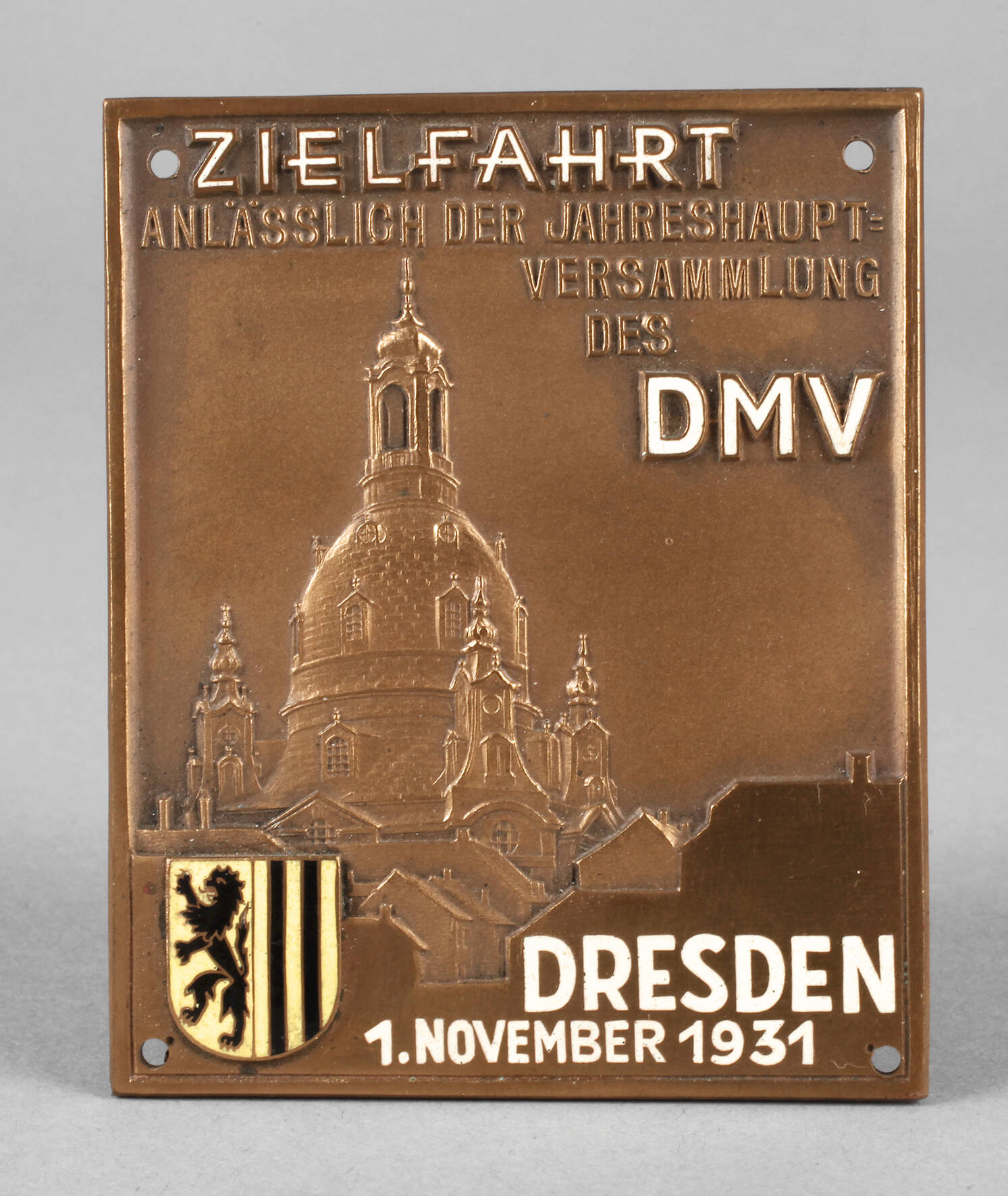 datiert 1931, Hersteller Gustav Brehmer Markneukirchen, Messing teils farbig emailliert, reliefiert mit Silhouette der Dresdner Frauenkirche, anlässlich der Jahreshauptversammlung des DMV, vier originale Bohrungen, Maße 8 x 6,5 cm.