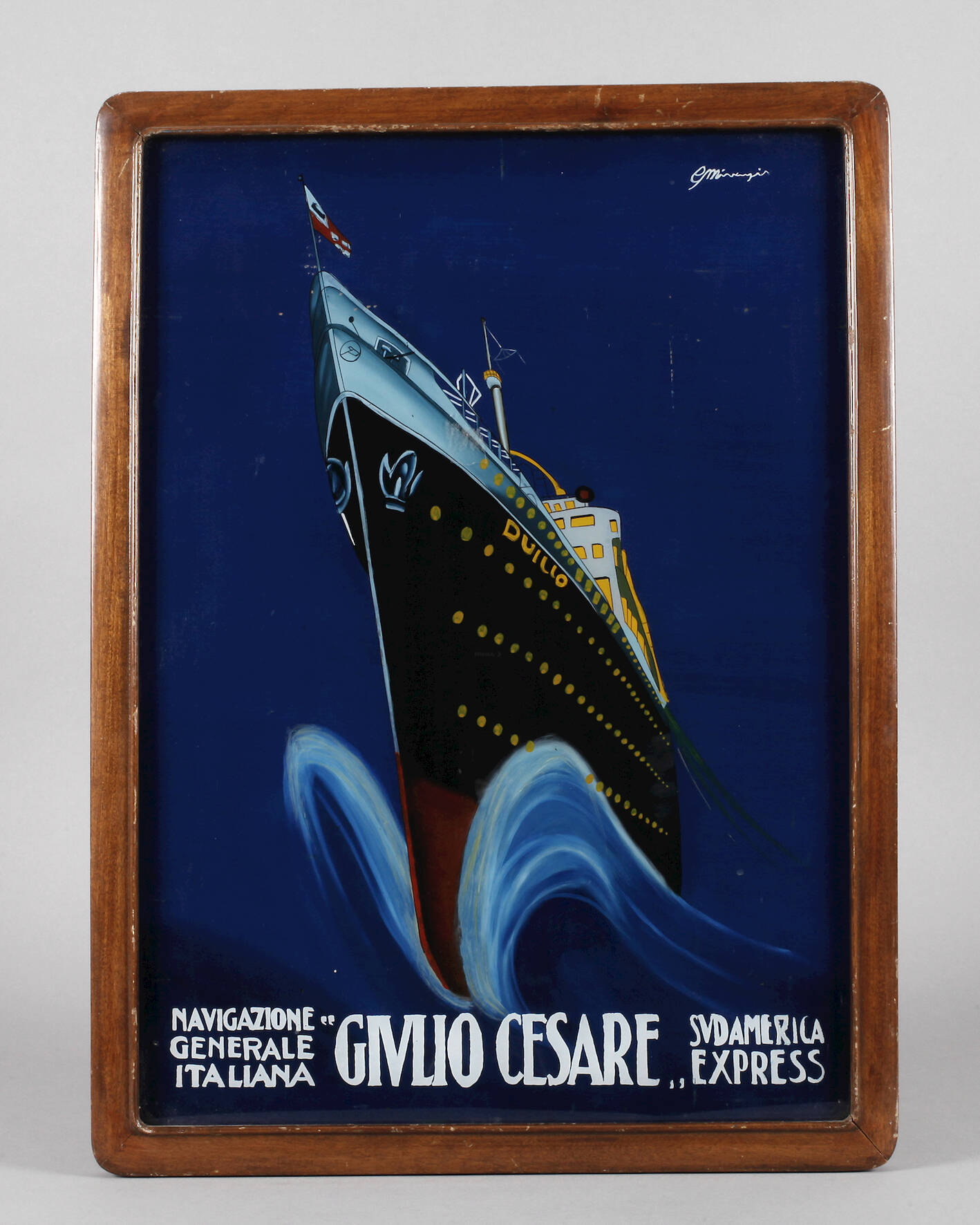 um 1910, bezeichnet Giulio Cesare Sud America Express, undeutlich signiert, mehrfarbige Hinterglasmalerei, welche den Überseedampfer Duilio zeigt, in schmaler Leiste gefasst, Altersspuren, Maße 58 x 42 cm.