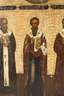 Russland, 19. Jh., kirchenslawische Tituli, Tempera auf kreidegrundierter, zweifach gesperrter Laubholzplatte, teils vergoldet, drei ausgewählte Heilige als frontale Standfiguren mit Evangelienbüchern, trocknungsrissig, Substanzverluste, retuschiert, Maße 31 x 26 cm.