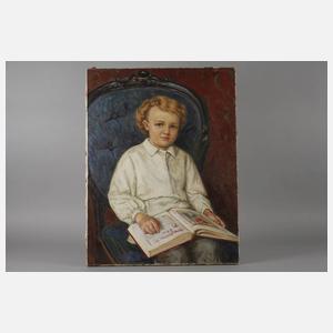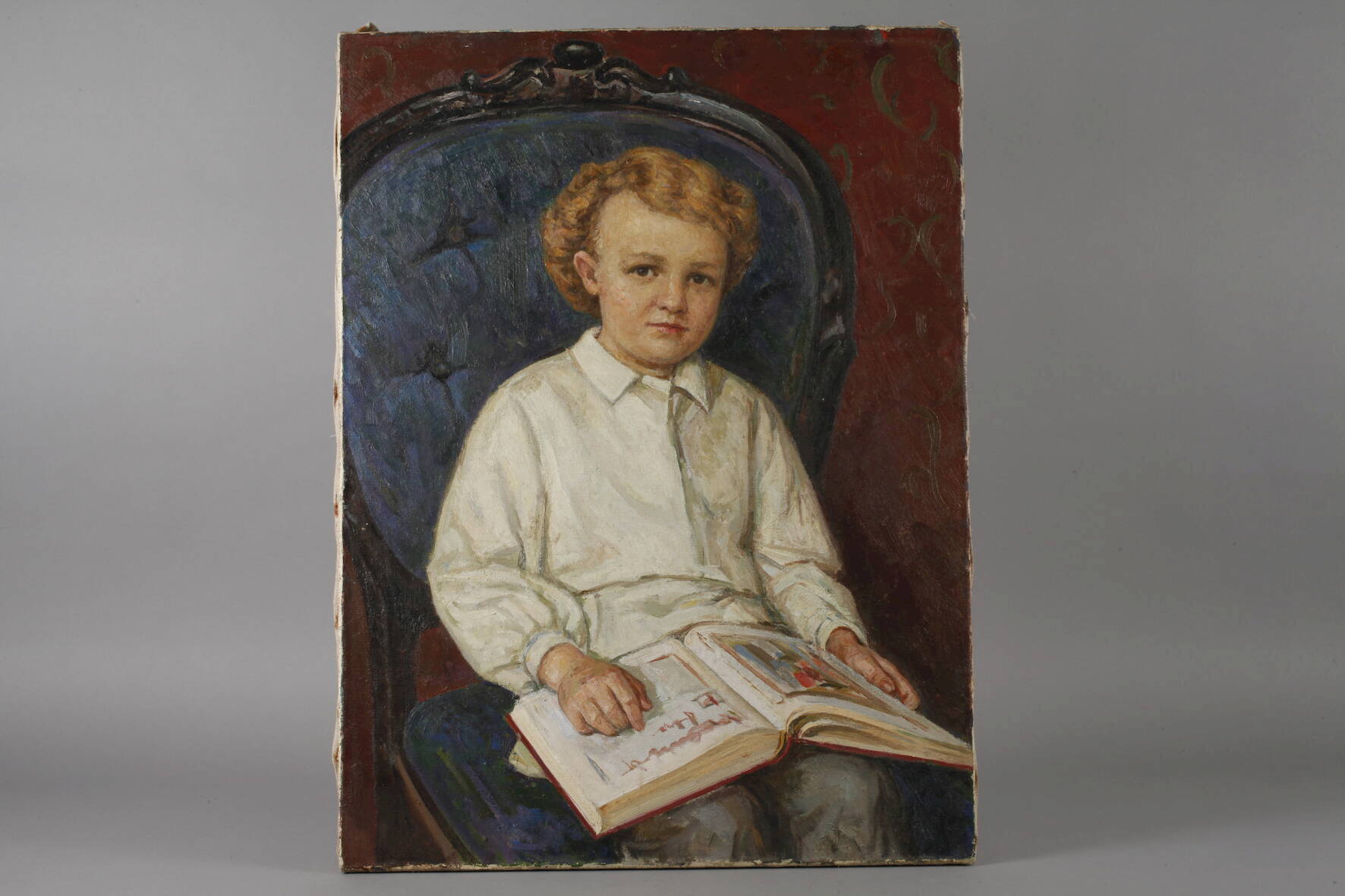 Kniestück des kindlichen Wladimir Iljitsch Uljanow (1870–1924) mit Buch im hohen Lehnsessel, dem Betrachter entgegenblickend, frühzeitig stellte Serow seine Kunst in den Dienst der jungen Sowjetmacht und wurde vor allem für seine Lenindarstellungen berühmt, die er sein ganzes Künstlerleben schuf, pastose Bildnismalerei, Öl auf Leinwand und neuem Keilrahmen, um 1950, unsigniert, rückseitig diverse fragmentarische Aufkleber, hier kyrillisch russisch bezeichnet "В. А. Серов »Когда был Ленин маленький, с кудрявой головой ...« - холст, масло, 80 х 60 см [deutsch: W. A. Serow »Als Lenin klein war, mit einem lockigen Kopf ...« - Leinwand, Öl, 80 x 60 cm]", und unleserlicher Stempel "... СССР [UdSSR] ...", minimale Craquelure, gering restaurierungsbedürftig, ungerahmt, Maße ca. 80 x 60 cm. Künstlerinfo: auch Vladimir Aleksandrovich Serov, russisch Владимир Александрович Серов, russischer bzw. sowjetischer Maler, Grafiker und Illustrator sowie Pädagoge (1910 Emmaus/Oblast Twer [эммаус тверская область] bis 1968 Moskau [Москва]), bedeutender Sowjetfunktionär und Vertreter des Sozialistischen Realismus in der Sowjetunion, studierte 1927–31 am Repin-Institut für Malerei, Bildhauerei und Architektur (LISchSA) Leningrad bei Vassili Jerménévitch Savinsky, 1931–33 Aspirantur bei Isaak Israilewitsch Brodski, 1933–42 Dozent am Repin-Institut für Malerei, Bildhauerei und Architektur Leningrad, später Präsident der Leningrader Künstlervereinigung, verblieb während der Blockade Leningrads 1941–43 im 2. Weltkrieg in der Stadt und wirkte innerhalb der Künstlergruppe "боевой карандаш [deutsch: kämpferischer Bleistift]", ab 1942 Mitglied der KPdSU, ab 1947 korrespondierendes Mitglied, schließlich 1954 Mitglied der Akademie der Künste der UdSSR und 1962–68 deren Präsident, ab 1958 Abgeordneter des Obersten Sowjet und Ehrung mit dem Titel "Verdienter Volkskünstler der UdSSR", 1960–68 Generalsekretär des Sowjetischen Künstlerverbandes, 1963–68 korrespondierendes Mitglied der Deutschen Akademie der Künste Ostberlin, Quelle: Saur "Bio-Bibliographisches Künstlerlexikon", Bénézit, Wikipedia und Internet.