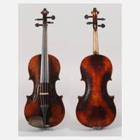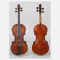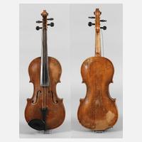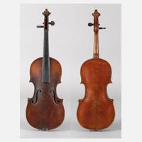 18. Jh., innen auf Klebezettel bezeichnet Georg Hornsteiner, Geigenmacher in Mittenwald sowie Reparaturzettel Andreas Joseph Grob, Straubing 1877, geteilter, gleichmäßig geflammter Boden in mittelbraunem Lack, umlaufende dreiteilige Randeinlage, fragmentarische Erhaltung, restaurierungsbedürftig, L Korpus 32,4 cm.