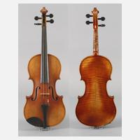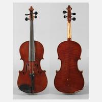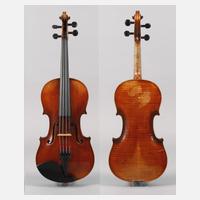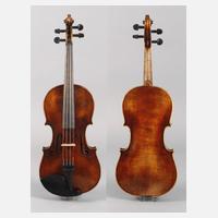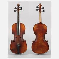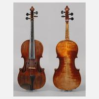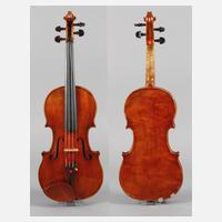 um 1930, innen auf Klebezettel bezeichnet Copy of Caspar do Salo in Brescia anno 1565, Korpus aus ausgesuchten Tonhölzern gefertigt, ungeteilter, gleichmäßig geflammter Boden in mittelbraunem Lack, ornamental gestaltete, umlaufende dreiteilige Randeinlage, beschnitzte Schnecke in Form eines weiblichen Haupts, verziert von vegetabilen Ornamenten, rissfreie, stark gebauchte Decke, sehr gepflegter, spielbereiter Zustand, L Korpus 35,5 cm.