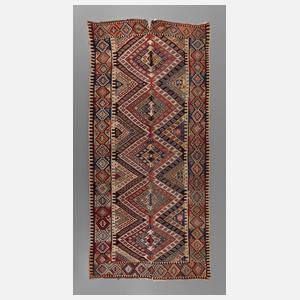 Mitte 19. Jh., in hellen Naturtönen gestalteter, flach gewebter Teppich mit zentralem Rautendekor, welcher sich in der breiten Bordüre spiegelt, mehrfach alt repariert, Erhaltungsmängel, Maße ca. 336 x 193 cm.