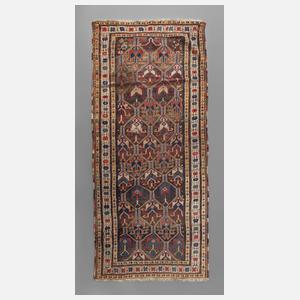 um 1880, in Erdtönen gehaltenes Modell mit wabenartig unterteiltem Innenfeld, welches wiederum von geometrischem Dekor verziert wird, mehrteilige umlaufende Bordürenbänder, Fransenbesatz gekürzt, Trittfalte, stärkere Ablaufspuren, Brauntöne korrodiert, Maße ca. 246 x 118 cm.