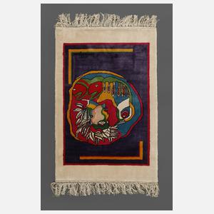 um 1990, rückseitig auf Etikett bezeichnet Chinaseide und nummeriert, im Motiv signiert, feiner Seidenteppich in leuchtendem Kolorit, zentrales Medaillon mit Profilkopf und Vogel, Schmalseiten mit Fransen, Maße 92 x 61 cm.