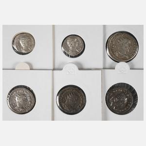 Denar der Julia Mamaea (D ca. 18 mm, s), Denar der Julia Mamaea mit stehender Vesta (D ca. 17 mm, s), Tetradrachme des Philippus Arabs um 244/249 n. Chr. aus Antiochia (D ca. 25 mm, ss+), Antoninian des Philippus Arabs mit Felicitas (D ca. 22 mm, ss), Antoninian des Philippus Arabs mit Darstellung des Adventus AVGG (D ca. 22 mm, ss), Antoninian der Otacilia Severa mit Darstellung der sitzenden Concordia (D ca. 22 mm, ss).