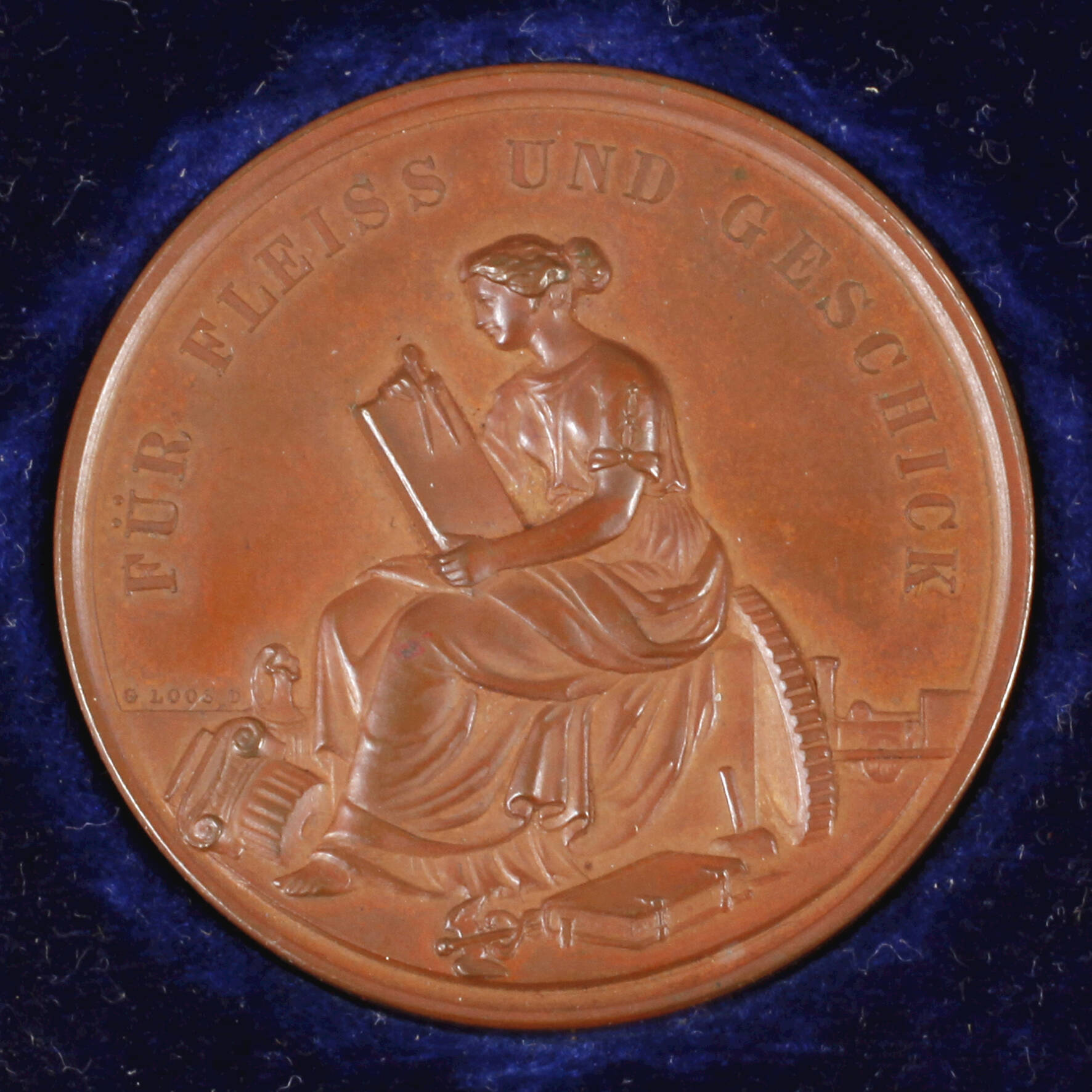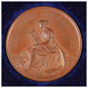 "Für Fleiss und Geschick", Medailleur G. Loos, undatiert, um 1870, Dedikationsgravur, in Originaletui, Bronze, D ca. 39 mm.