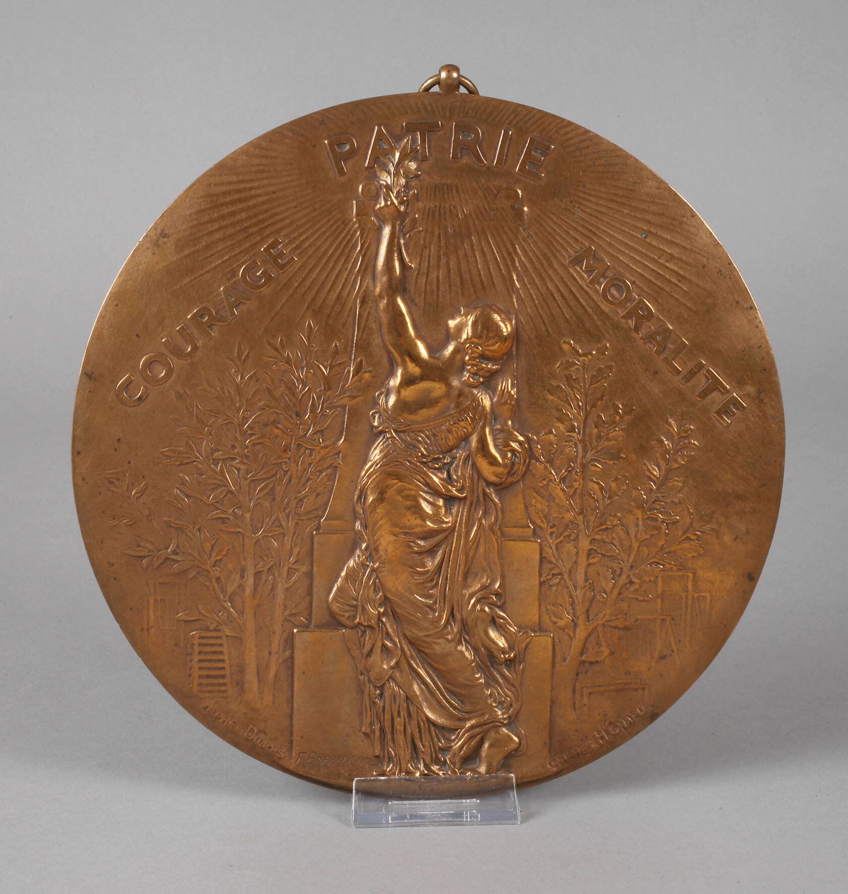 von Alphée Dubois nach H. Chapu, Bronze, einseitig gegossen, Ausführung F. Barbedienne, Dame vor Altar des Vaterlands, flankiert von Lorbeer und Eichenbaum, ss+ und Patina, Hängering, D ca. 25,3 cm.