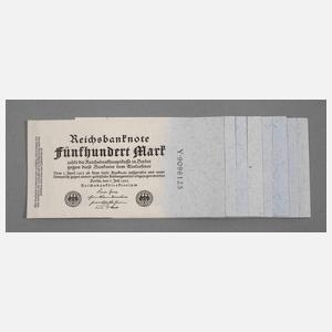 10 Stück 500 Mark, Berlin, den 7. Juli 1922, laufende Nummerierung Y9096116 bis Y9096125, seltene Farbgebung, bankfrisch erhalten.