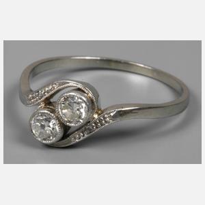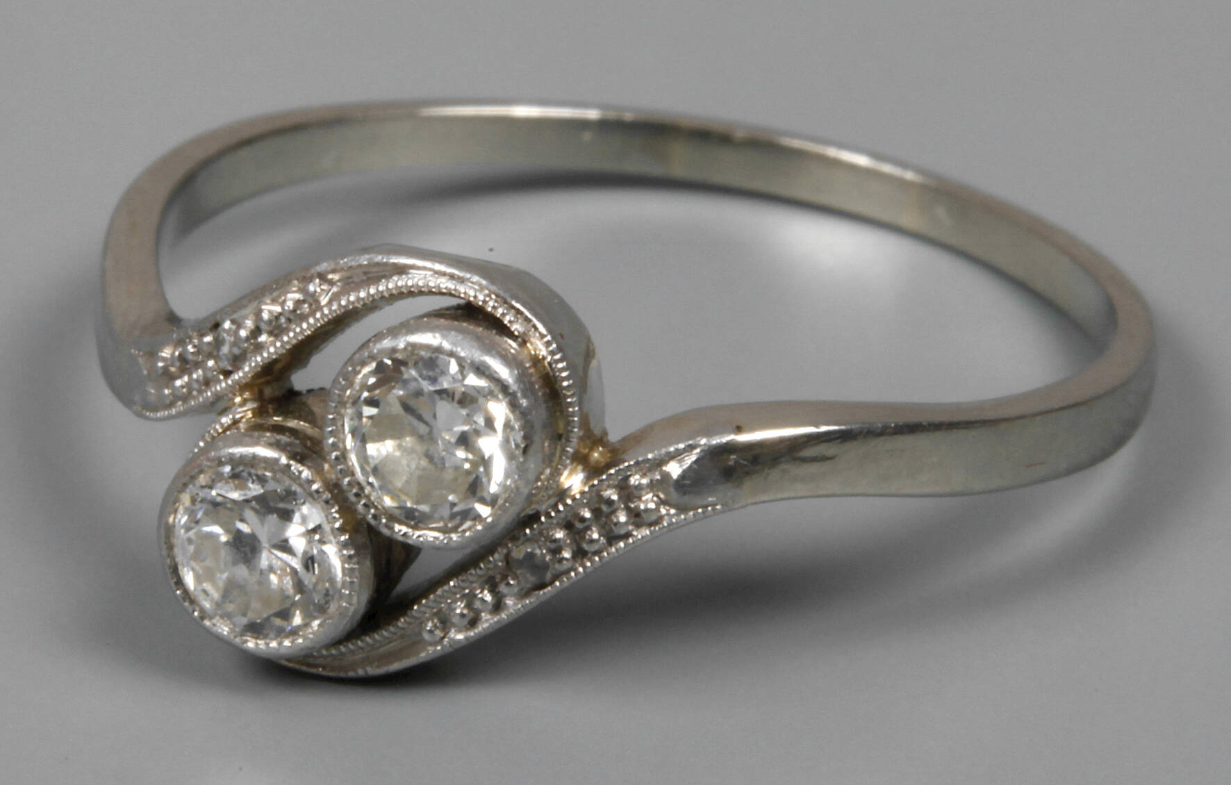 um 1910, Weiß- und Gelbgold gestempelt 590 und weitere Punze, ca. 8 mm hoher geschwungener Ringkopf, besetzt mit zwei Brillanten von je ca. 0,2 ct in Zargenfassung und zwei Diamantrosen, leichte Tragespuren, RW 20 mm, G ca. 2,7 g.