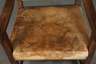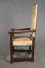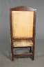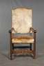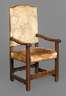 um 1700, Eiche massiv, dunkelbraun gebeizt, die Vorderbeine mit geschnitztem Schuppenmotiv, leicht geschwungene Armlehnen mit Volutenabschluss, pergamentfarbener Lederbezug erneuert, restauriert mit Ergänzungen, stabiler Zustand, Maße 125 x 62 x 57 cm.