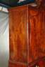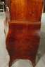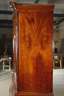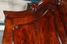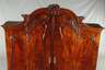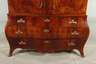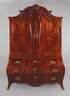 Holland, Ende 18. Jh., Mahagoni auf Eiche furniert, zweiteiliger Korpus auf dreischübigem Kommodenunterteil, dreiseitig bombiert, der hohe zweitürige Aufsatz mit leicht gebauchter Front, verziert von fein geschnitztem Blütenkorb und Festons, originale Messingbeschläge mit Amphorenmotiv und Widderköpfen, Inneneinrichtung aus zwei Regalböden und fünf flachen Schubkästen, alt restauriert, Alters- und Gebrauchsspuren, Maße 255 x 193 x 60 cm.