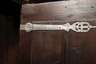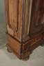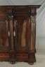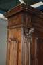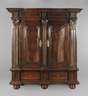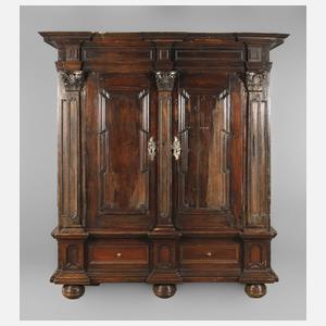 17./19. Jh., laut Angaben des Einlieferers aus Schloss Leitheim bei Donauwörth, Nadelholz braun gebeizt, zerlegbarer zweitüriger Schrank mit außenliegenden Schubkästen, fassadenartig gegliederte Front mit geschnitzten korinthischen Kapitellen und Flammleisten verziert, schmiedeeiserne Bänder und Beschläge, originales Schloss und Schlüssel, alt restauriert mit Ergänzungen, Alters- und Gebrauchsspuren, Maße 200 x 190 x 60 cm.