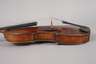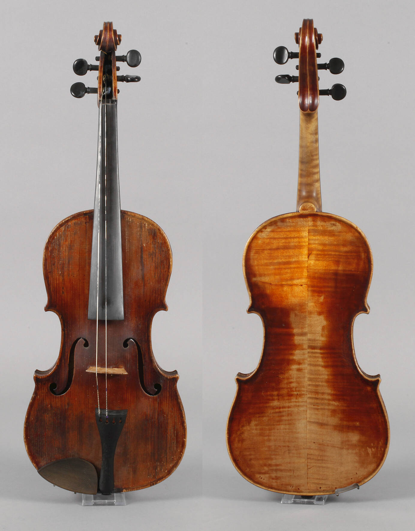um 1900, mit Klebezettel bezeichnet E... di Eugenio anno 190..., geteilter, schwach geflammter Boden in bernsteinfarbenem Lack, umlaufende dreiteilige Randeinlage, mit mehreren verfestigten Rissen, restaurierungsbedürftig, mit zwei defekten Bögen im Etui, L Korpus 39,4 cm.