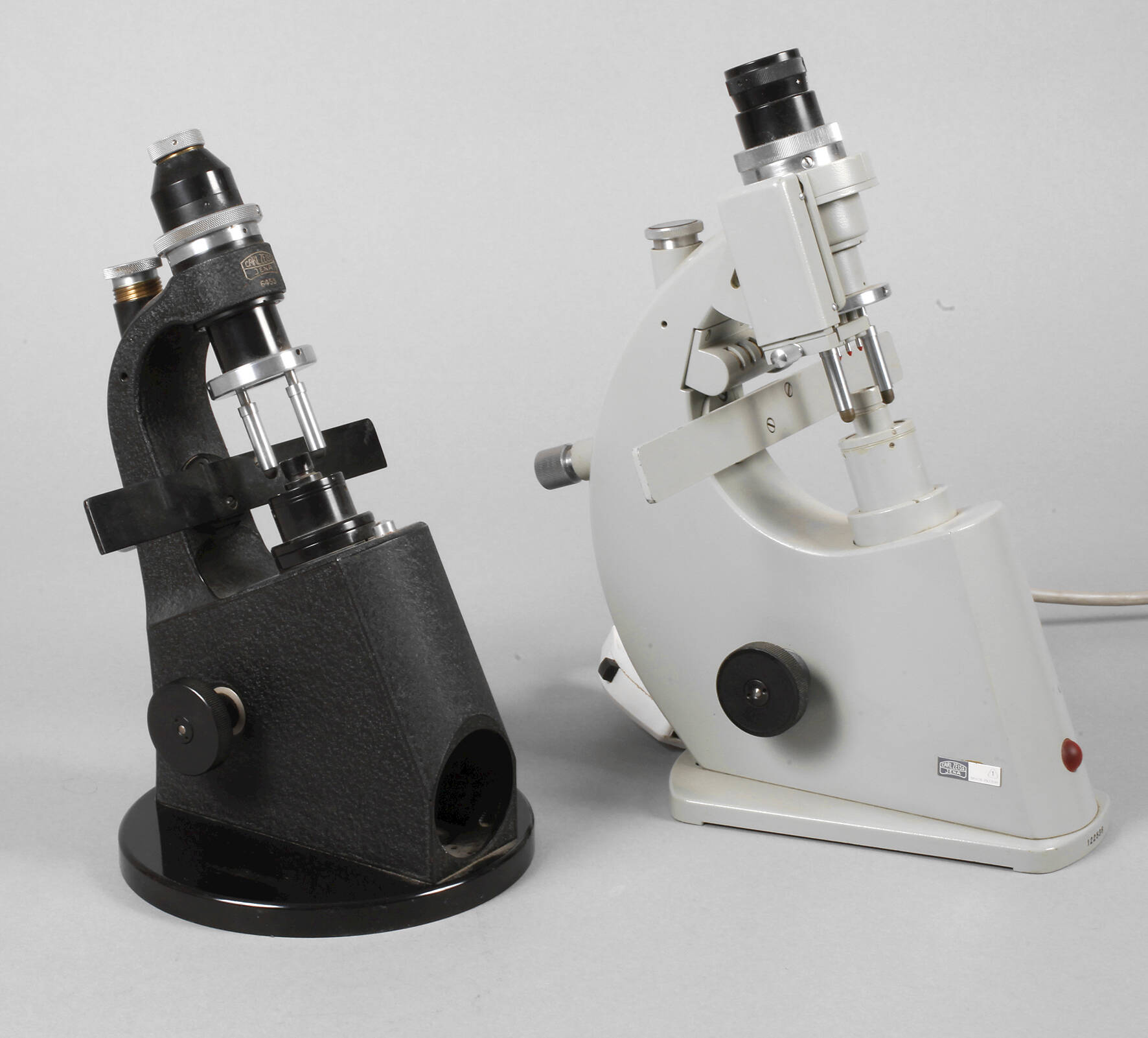 um 1970, Metallguss grau und schwarz gefasst, Scheitelbrechwertmesser, einer gemarkt Carl Zeiss Jena 6453, Geräte zur Bestimmung der Dioptrien und Prismendioptrien, Gebrauchsspuren, H 28 und 29 cm.