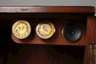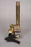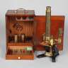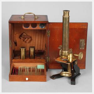 Ende 19.Jh., gemarkt E. G. Wood London, geschwärzter Eisengussfuß mit Messingmontierungen, schraubbarer Tubus, Wechselokulare, im originalen Mahagonikasten, innenliegender kleiner Schub mit Objektproben, Alters- und Gebrauchsspuren, H ca. 33 cm.