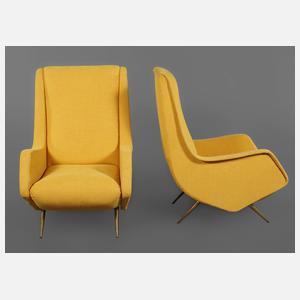 1950er Jahre, für ISA Bergamo, bequeme Loungesessel mit Armlehnen, auf kurzen Metallfüßen, gelber Wollripsbezug erneuert, Bodengleiter fehlen, Maße je 96 x 66 x 79 cm.