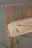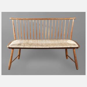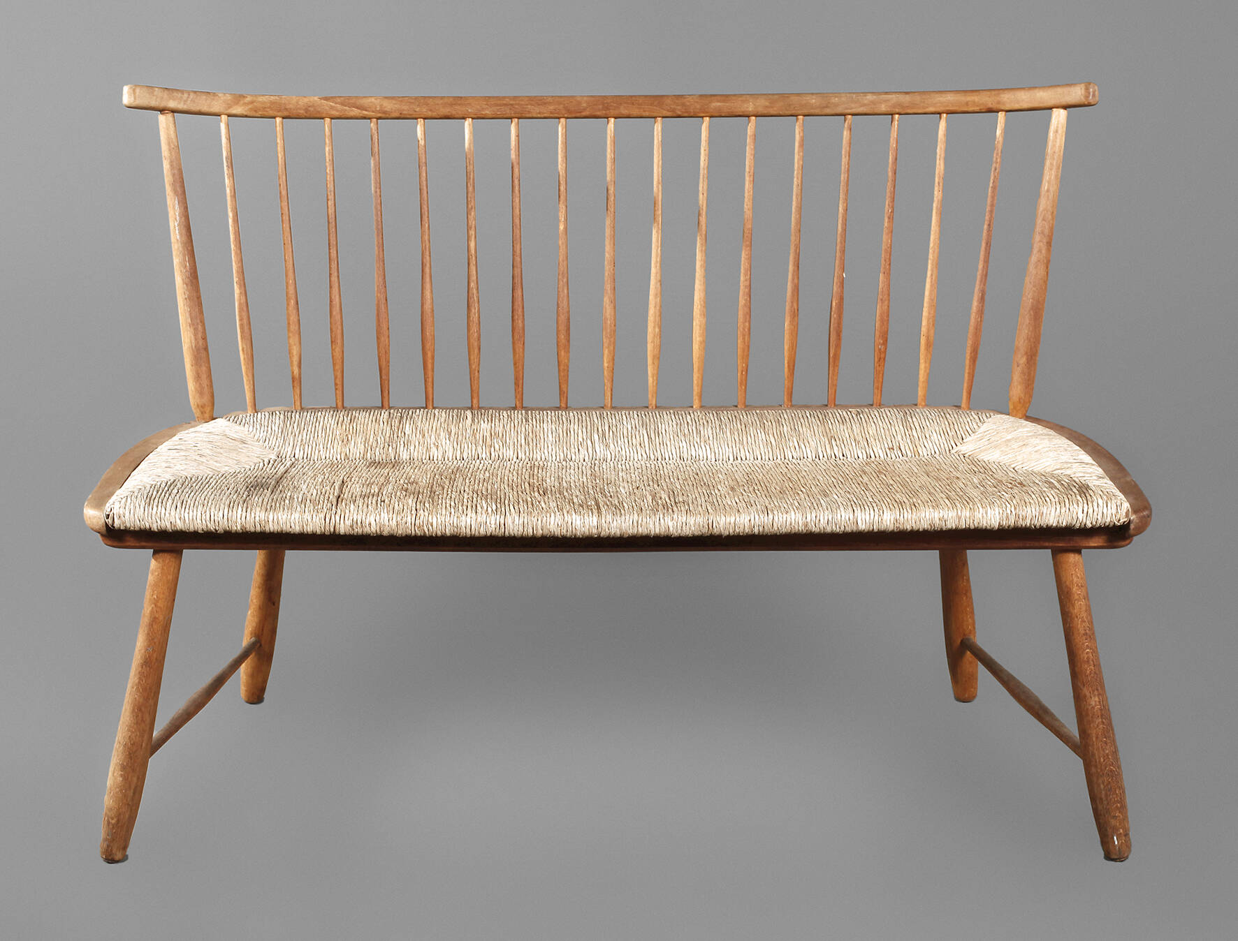 Entwurf 1953 für WK Sozialwerk, Gestell aus Buche massiv, Sitzfläche mit originalem Binsengeflecht, Oberfläche mit Alters- und Gebrauchsspuren, Maße 85 x 121 x 55 cm.