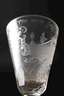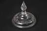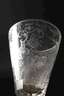 wohl Sachsen oder Thüringen, 18. Jh., farbloses Glas, gewölbter Scheibenfuß mit nach unten umgeschlagenem Rand und Abriss, facettierter Balusterschaft, konische Kuppa mit Ornamentband und feinem Mattschliffdekor, umlaufendes Spruchband "Daß ist eine große Pein wer de steht vorm Betth und darff nicht rein", entsprechende Bilddarstellung, Deckel ergänzt, H 34 cm.