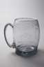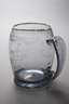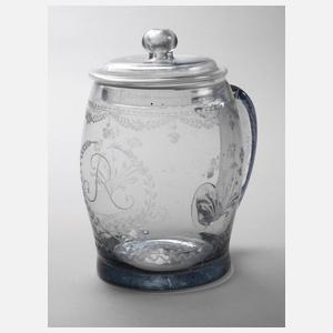 um 1800, farbloses Glas, blasiger Abriss, bauchig, mit breitem, angesetztem, freigeformtem Henkel, mattgeschliffen mit Besitzermonogramm R im Blattkranz, Festons, Blüten und Ornamentbänder, der Lippenrand mit aufgelegtem weißen Band, dieses beschädigt, H 20 cm.