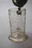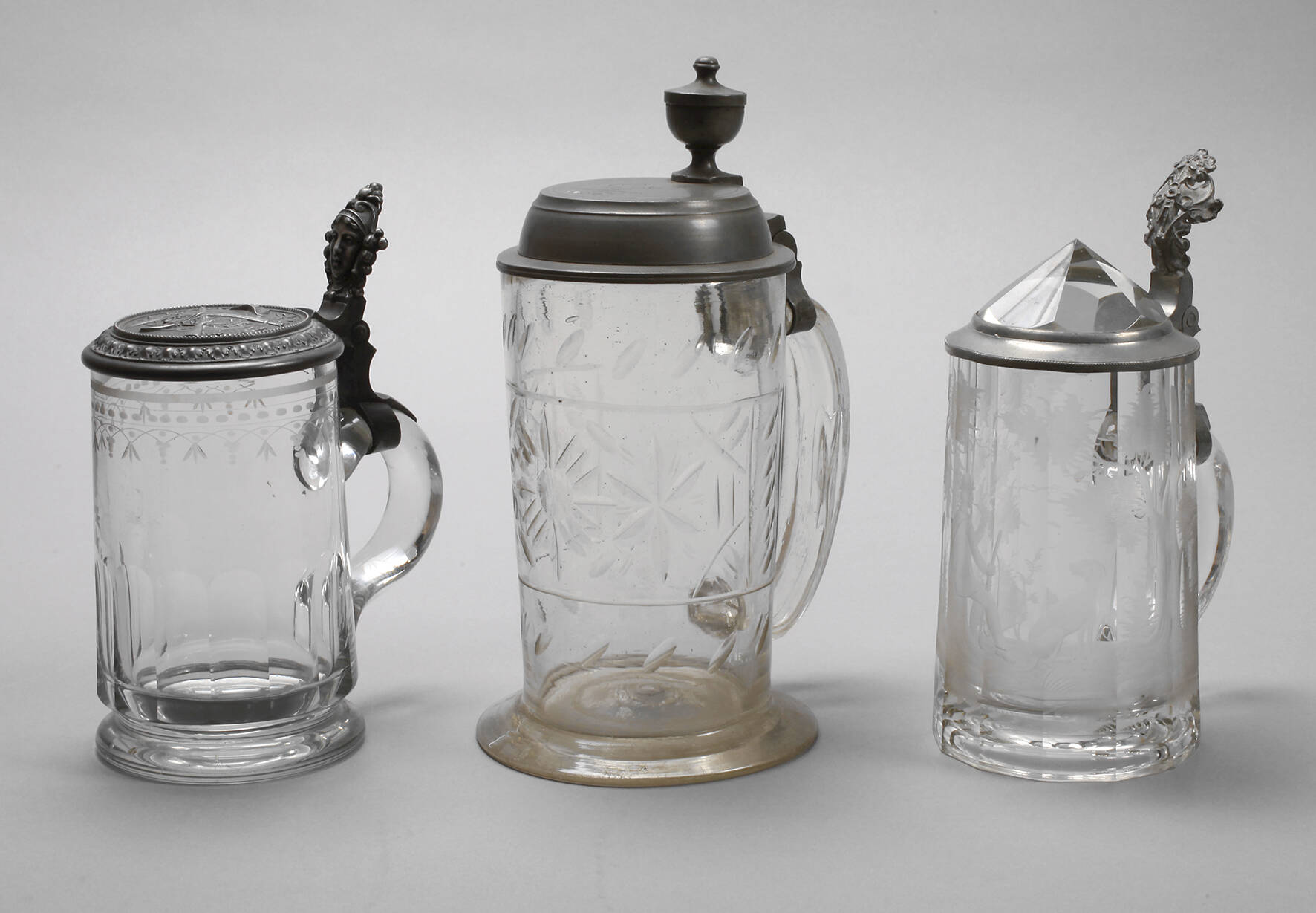 1. und 2. Hälfte 19. Jh., farbloses Glas mit ausgekugeltem Abriss bzw. formgeblasen, einer mit plangeschliffenem Stand, verschieden geschliffen, Zinndeckel, Hochzeitskrug signiert C. G. Lützner 1821, einer mit Jagdmotiv, Jäger und Hund im Wald sowie Prismendeckel, dazu Schützenkrug mit gekreuzten Gewehren, Eichenlaub und anderem Zierrat, alle gut erhalten, H max. 24 cm.