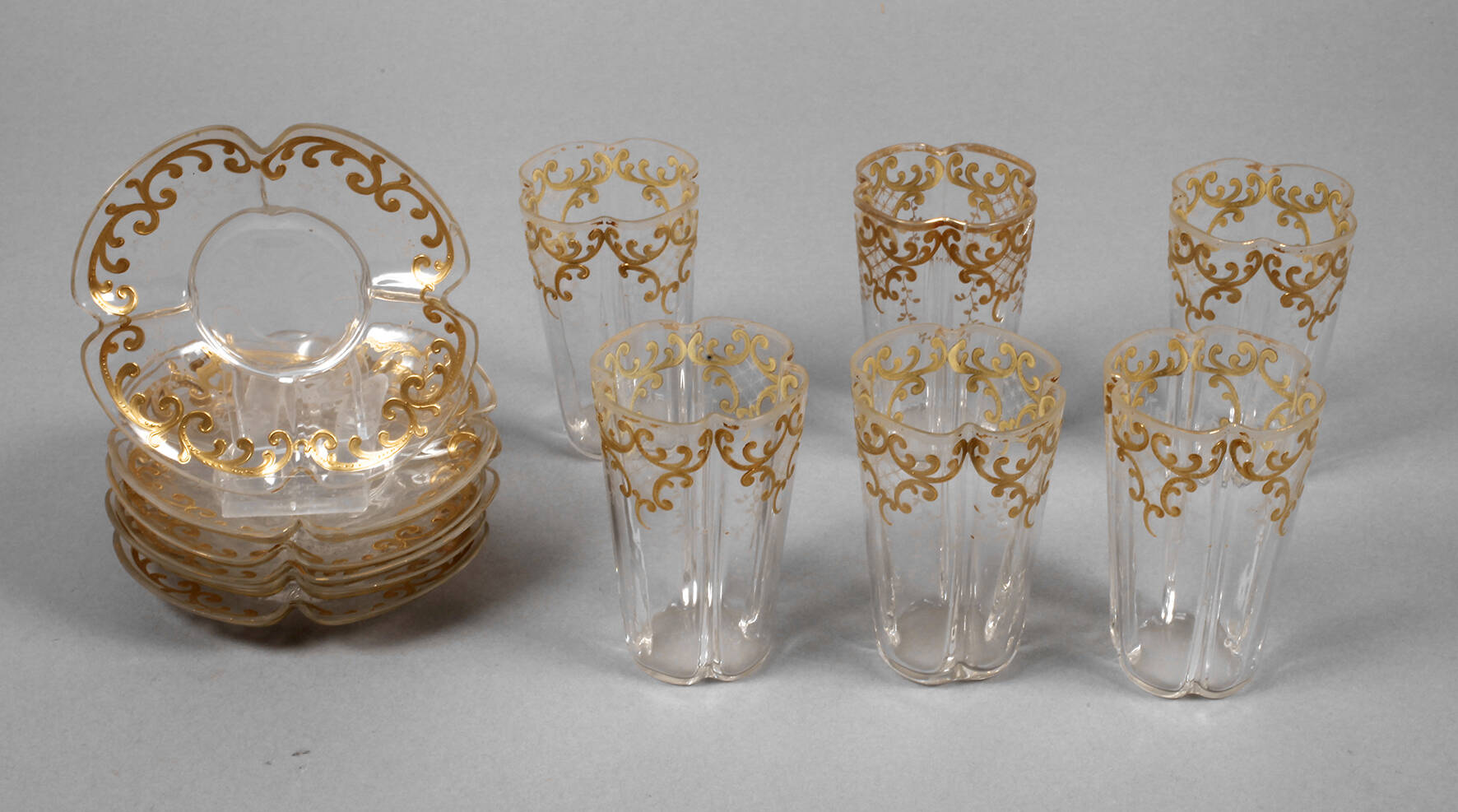 Ende 19. Jh., farbloses Glas, plangeschliffener Stand, vierfach geschweifte Gläser mit Unterteller, Reliefgoldmalerei mit Rocaillemotiven, Gitterdekor und Blattranken, partiell berieben, H zus. je 10,5 cm.