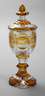 Böhmen, 19. Jh., farbloses massives Glas, partiell gelb gebeizt, Walzenschlifffuß, Balusterschaft, die Kuppa mit sechs geschliffenen Kartuschen, darin verschiedene Tiermotive, vorwiegend jagdlich, guter unbeschädigter Zustand, H 27 cm.