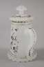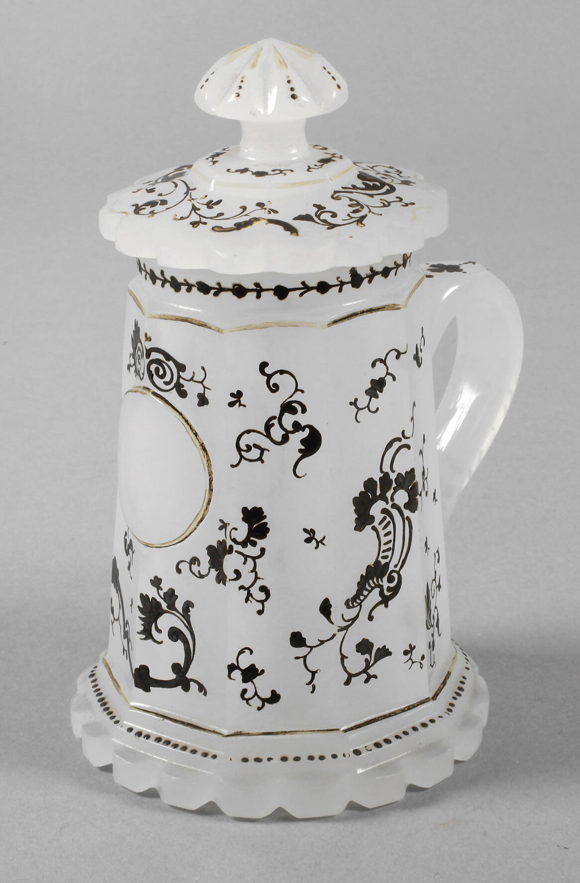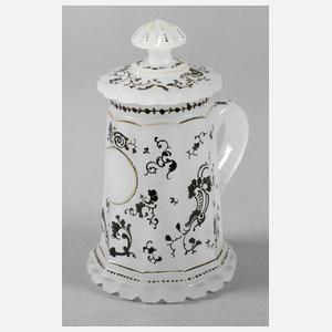 Mitte 19. Jh., aus weißlichem Alabasterglas, mit geschliffenem Bodenstern, konische facettierte Wandung, angesetzter Henkel, schauseitig eine runde offene Monogrammkartusche, versilberte gehöhte Emailbemalung, guter Zustand, H 13,5 cm.