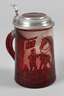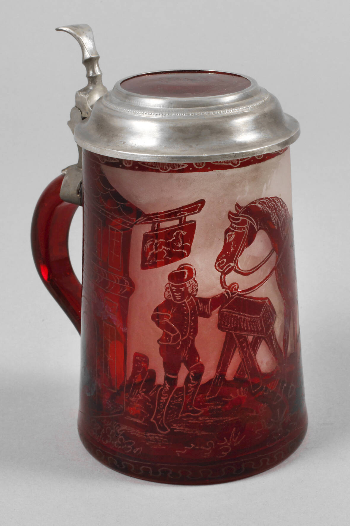 Mitte 19. Jh., farbloses mattiertes Glas, geschliffen, geätzt und rot gebeizt, zinngefasster Deckel, Reitermotiv und Deckel mit Hund, im Boden eine Rosette, guter altersgemäßer Zustand, H 16,5 cm.