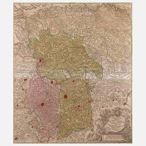 rechts unten figürliche Kartusche und hier betitelt "Nova Tabula Geographica exhibens Ducatum Brabantiae ... Tobiae Conradi Lotter Geogr. Aug. Vindel." Darstellung des Gebiets des Herzogtums Brabant in der Ausdehnung der Zeit mit Anrainerstaaten, auf der Karte sind unter anderen zu finden: Antwerpen, Mons, Brüssel und Maastricht, Kupferstich mit Flächenkolorit, Mitte 18. Jh., mittig übliche Faltlinie, teils leicht gebräunt, unter Passepartout und hinter Glas gerahmt, Passepartoutausschnitt ca. 57,5 x 48,5 cm. Künstlerinfo: auch Tobias Conrad Lotter, dt. Landkartenstecher, Kartograph und Verleger (1717 Augsburg bis 1777 Augsburg), ab 1740 Schwiegersohn und produktivster Mitarbeiter des Karthographen und Verlegers Matthäus Seutter, 1740–44 schuf er eigenverantwortlich unter Seutter den „Atlas Minor“, nach dem Tode von Seutter (1757) führten sein Sohn Albrecht Karl (1722–1762) und sein Schwiegersohn Lotter sowie G. B. Probst die Firma weiter, 1757/58 wurde Lotter alleiniger Eigentümer des Verlages, Quelle: Thieme-Becker und Wikipedia.