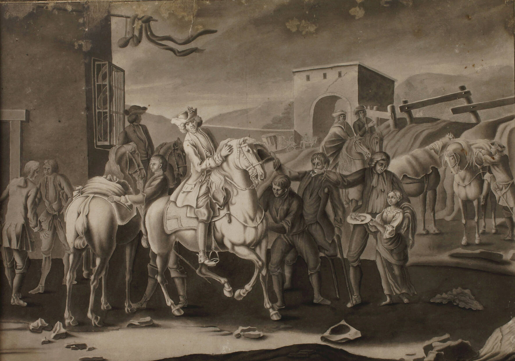 elegant gekleideter Herr zu Pferd, umgeben von seinem Gefolge und ihm Ehrerbietung zollenden Bewohnern einer Stadt, lavierte Tuschefederzeichnung, 2. Hälfte 18. Jh., auf Karton kaschiert, Erhaltungsmängel, unter Passepartout (verrutscht) und hinter Glas gerahmt, Passepartoutausschnitt ca. 47,5 x 64 cm. Künstlerinfo; österr. Zeichner und Buntmaler, tätig an der Wiener Porzellanmanufaktur in der 2. Hälfte des 18. Jh., Quelle: Thieme-Becker.