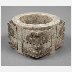 20. Jh., ungemarkt, zylindrisches Innenleben gerahmt von quadratischer Wandung, verziert von Liang Zhu-Symbolik, Altersspuren, winz. best., H 5,5 cm, D 8 cm.