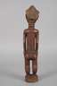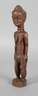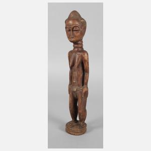 Westafrika, der Volksgruppe der Baule zugeordnet, Hartholz geschnitzt und rotbraun gefasst, vollplastische Darstellung einer stehenden Frau mit ausdrucksstarkem Gesicht, leicht berieben, H 40 cm.