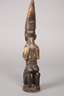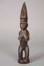 nzl., Yoruba/Nigeria, Tropenholz geschnitzt und dunkel gefasst, weibliche kniende Figur mit angedeutetem Spitzhut, auf flachem Rundsockel, Altersspuren, H 31 cm.