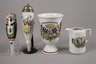 Porzellanpfeifenkopf "Andenken von meinem Freund Friedrich Ohler, b. d. 8. Comp. Hohenz. Füsl. Regt. Nr. 40 in Cöln 1888" (Vergoldung am Rand überstrichen), ein weiterer Pfeifenkopf mit floraler Zier, ein patriotischer Becher und ein Sahnekännchen, jeweils Bestoßungen, dazu ein Paar Schulterstücke (Erhaltungsmängel).