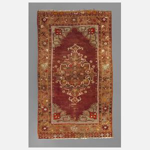 1. Hälfte 20. Jh., das rote, von Bordüren gefasste Mittelfeld verziert von üppigem Medaillon, Fransenbesatz gekürzt, Ablauf- und Altersspuren, Maße 186 x 116 cm.
