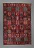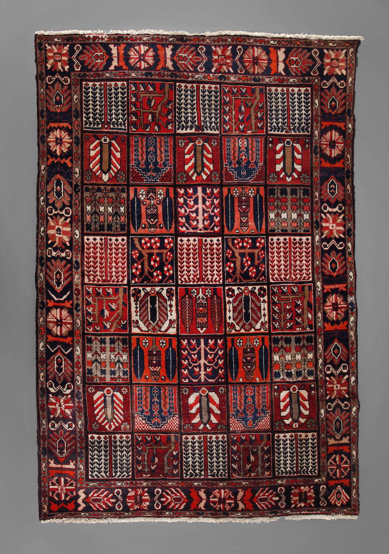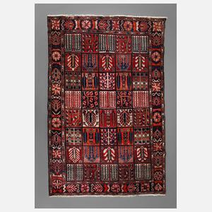 2. Hälfte 20. Jh., in dunklem Kolorit gehaltener Teppich mit schachbrettartig gemustertem Mittelfeld im Stil eines Gartenteppichs, gerahmt von Blütenbordüre, Fransenbesatz gekürzt, partielle Mottenschäden, sonst gute Erhaltung, Maße ca. 304 x 210 cm.