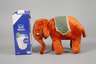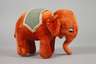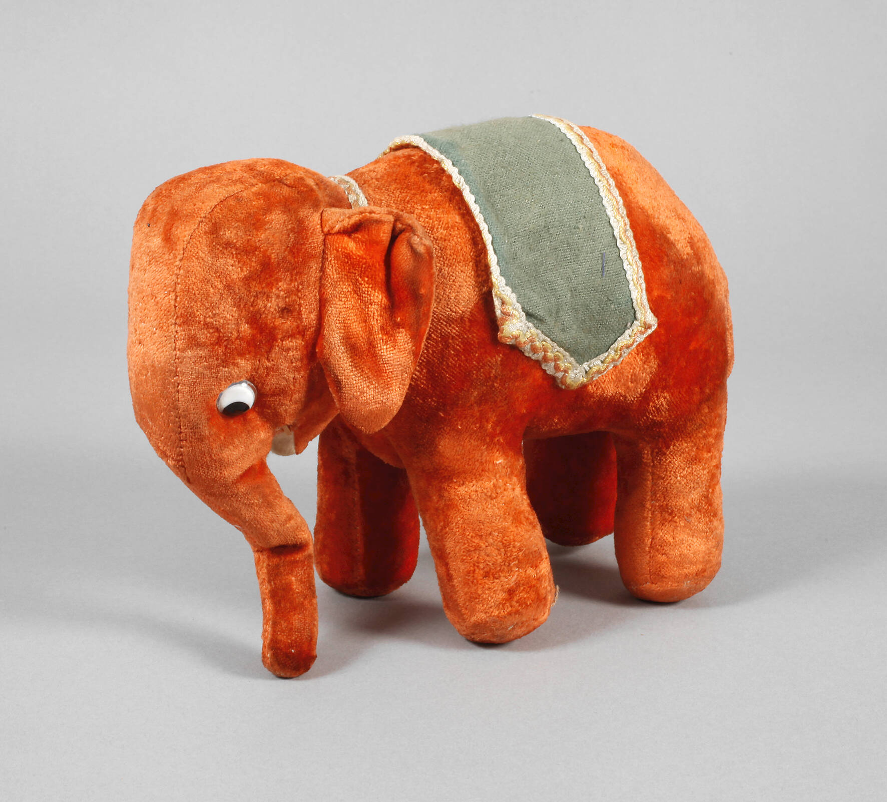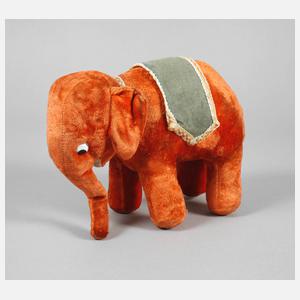 eventuell Steiff, um 1950, ungemarkt, orangefarbener Samt hart holzwollegestopft, stehender ungegliederter Elefant mit Schielaugen aus Glas und original gehefteter Schabracke sowie Halsband, beide Stoßzähne fehlen, sonst guter altersgemäßer Zustand, H 17 cm.